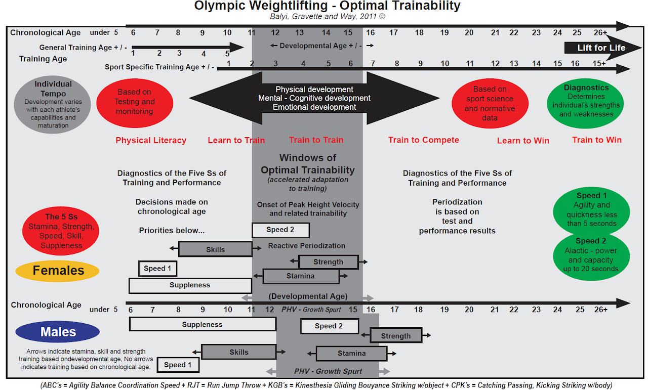 If Weightlifting athletes are to fulfill their genetic potential, correct training must be provided during the sensitive periods or “windows of optimal trainability” indicated in the diagram above. However, since the sensitive periods can vary between individuals according to their growth, maturation, and genetic predisposition, a long-term approach to athlete development is needed to ensure that individuals who respond slowly or late to training stimuli are not deprived of opportunities. In addition, measurement and monitoring should be used to determine each athlete’s Developmental age in line with the diagram above.